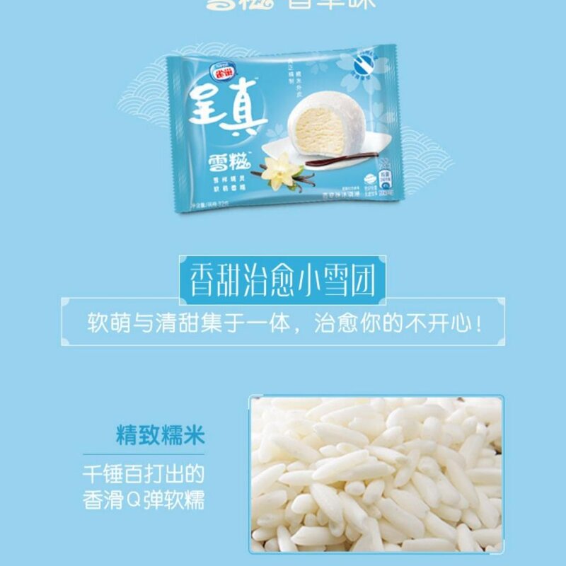 产品特点:外表粘糯圆润,内心细腻柔滑,香Q糯米皮包裹香草口味冰淇淋,雀巢雪糍,Q弹清爽